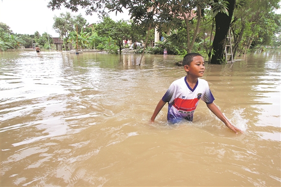 当地时间3月10日,在印度尼西亚中爪哇省斯拉根,一名男孩涉水前行。印度尼西亚中爪哇省近日强降雨致梭罗河水位升高,部分区域遭遇洪水灾情。新华社发(布拉姆·泽洛 摄)