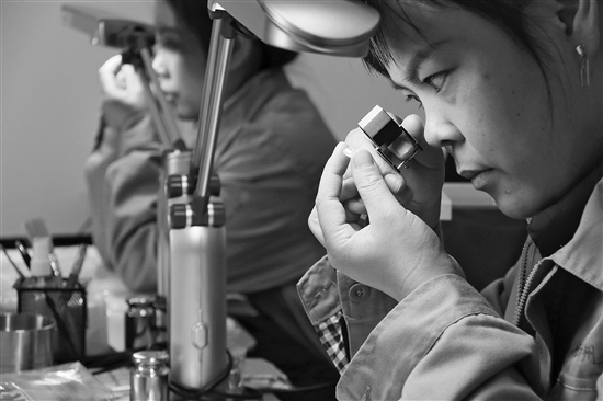 3月8日,河南省南阳市方城县,河南神州灵山新材料有限公司员工正在生产大单晶金刚石,这些产品随后将发往海外市场。