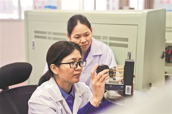 图为3月4日,高珠(左)和蒙小花在测试继电器零部件参数。李钰丹 文 袁俊杰 摄