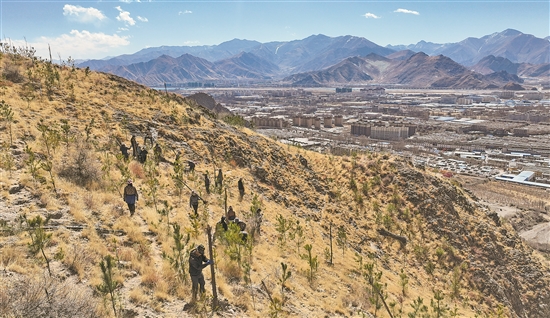3月12日,西藏拉萨市堆龙德庆区东嘎社区二组村民在西嘎山植树。