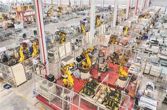 在位于浙江省湖州市长兴经济技术开发区的长兴地通汽车部件有限公司,全自动机器人高速运转生产新能源汽车配件订单产品。