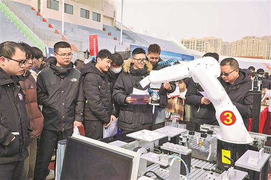 日前,在山东省青岛市李沧区总工会承办的青岛市高校毕业生就业服务活动启动仪式暨大型招聘会现场,一家招聘企业带来的工业机器人产品吸引多名高校毕业生驻足咨询。杨明清 本报记者 张嫱 摄