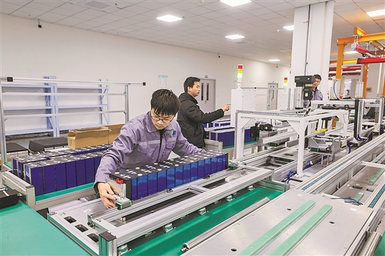 3月12日,在诸暨市店口镇解放湖工业园区联强锂能科技(浙江)有限公司车间内,自动化流水线上在生产储能电池组。