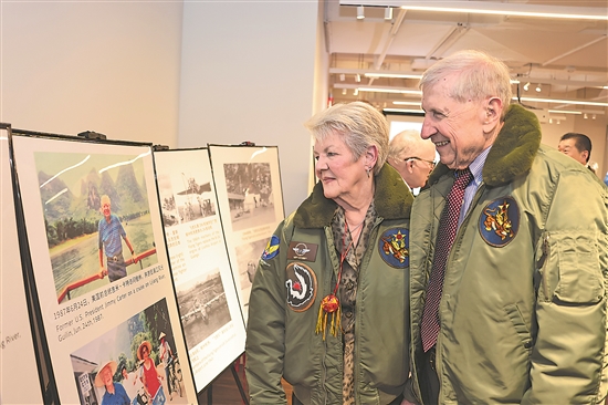 当地时间3月11日,美中航空遗产基金会副主席金坎农(左)及其丈夫身着飞虎队制服在美国纽约参观“中美友好在广西”图片展。为庆祝中美建交45周年,“中美友好在广西”图片展11日在纽约开幕。 新华社发(周焕新 摄)