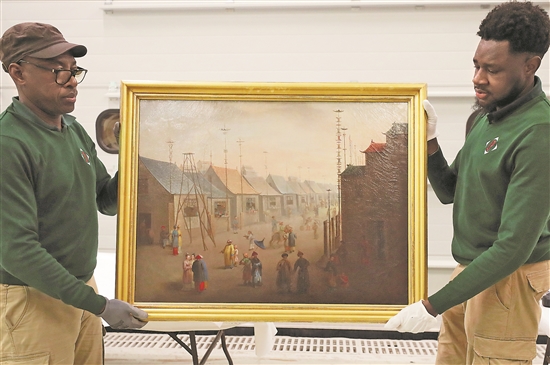 当地时间3月11日,在法国巴黎近郊的凡尔赛宫,工作人员准备打包油画《南京的集市》。新华社记者 高静 摄