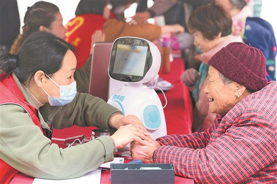 3月14日,安徽省六安市金安区东市街道建来社区,社区养老服务驿站和爱心企业志愿者用便携式检测仪为老年居民做心电图。
