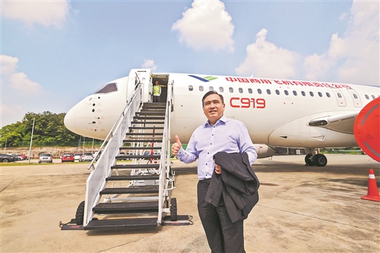 中国国产商用飞机ARJ21和C919日前飞抵位于马来西亚雪兰莪州的苏丹阿卜杜勒·阿齐兹·沙阿机场,进行地面静态展示和演示飞行。图为马来西亚交通部长陆兆福与C919大飞机合影。 新华社发(张纹综 摄)