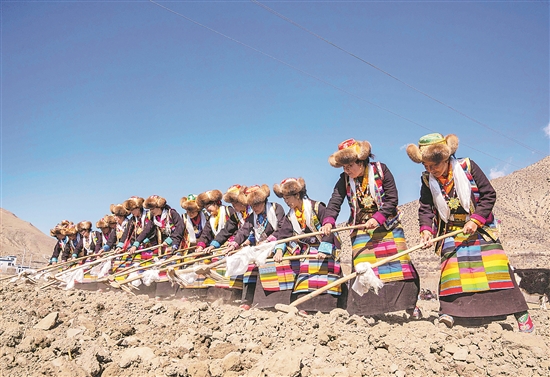 这是3月16日拍摄的西藏自治区山南市琼结县加麻乡加麻村的春耕仪式现场。当日是西藏举行一年一度春耕大典的日子。村民身着节日盛装,手捧“切玛”(五谷丰登斗),唱起祈愿歌,互敬青稞酒。新华社记者 旦增尼玛曲珠 摄