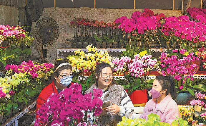 3月17日,北京的一家鲜花市场,消费者正在选购花卉产品。