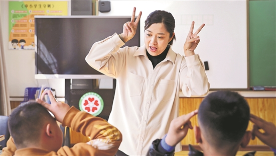 近日,凤城特殊教育学校的老师赵阅在课堂上带着学生一起做手指操。