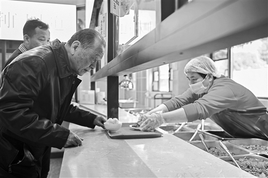 近年来,湖北省荆门市通过政府购买服务、合作共建等方式,打造“幸福里食堂”,为老年人提供价格优惠的老年餐,惠及众多老年人。图为老人选取餐品。新华社记者 杜子璇 摄