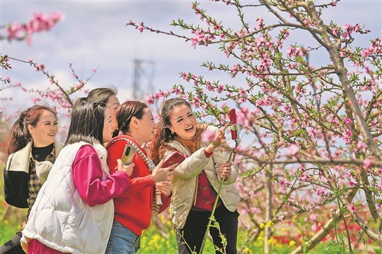 3月18日,游客在四川省南充市蓬安县新园乡宽敞沟村桃花园里赏花游玩。