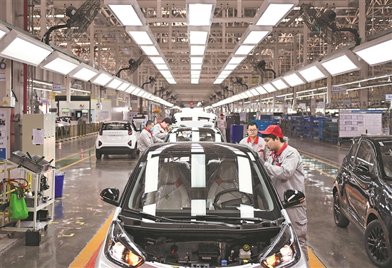 3月19日,奇瑞新能源汽车股份有限公司石家庄分公司的工人在总装车间生产线上工作。