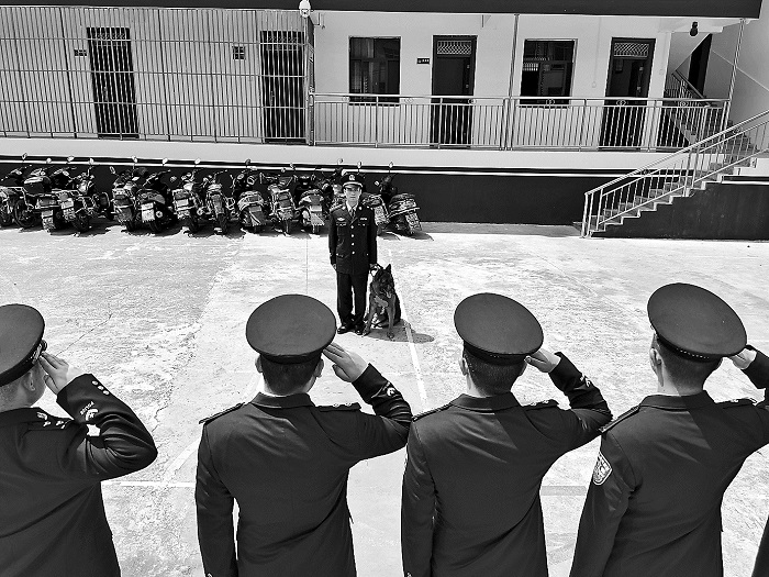 黑泽退役那天,郎恒边境派出所全体民辅警,向它敬礼送别。戴着大红花的黑泽,颤巍巍地艰难起身,回礼告别战友。