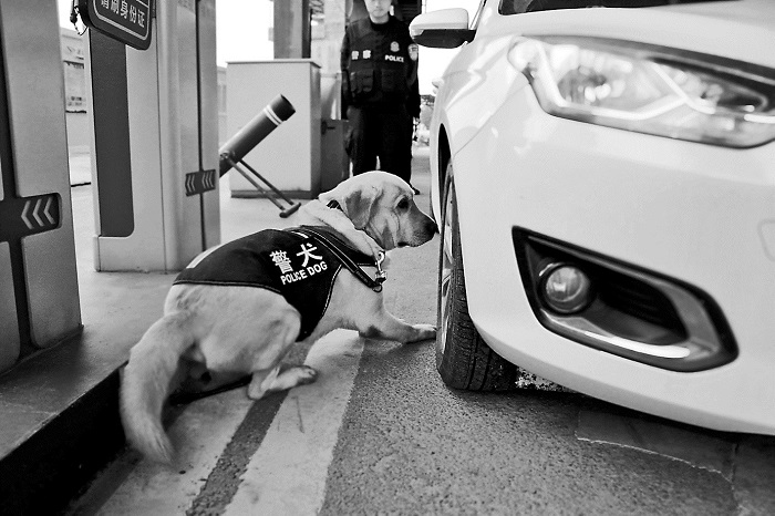 这天,迎春牵着警犬在某口岸例行搜车。云宝围着车、伸着鼻子嗅了一圈,快走到车尾时,突然折返回来,凑近左前方的车轮闻了又闻,“啪”的一声卧了下来。