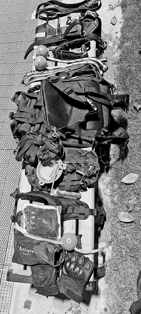 走进小院,平房旁边的水泥地上,分区摆着火圈、行李箱、扑咬袖等各种驯犬工具,有的用于训练警犬嗅觉,有的用来锻炼服从性,还有的用以提升扑咬能力,以及其他技能和本领。