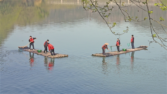 3月20日,浙江省台州市仙居县步路乡党员志愿者与河长一起在永安溪巡河护水,清理杂物垃圾。