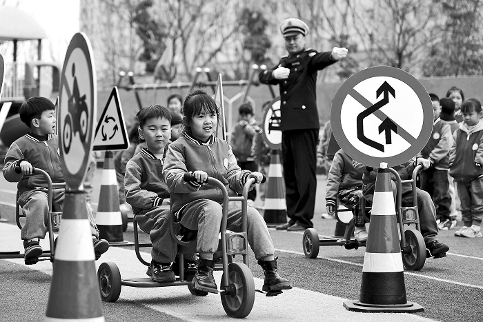 3月18日,山东省枣庄市公安局市中分局交通警察大队民警在一家幼儿园,与孩子们一起互动交流。