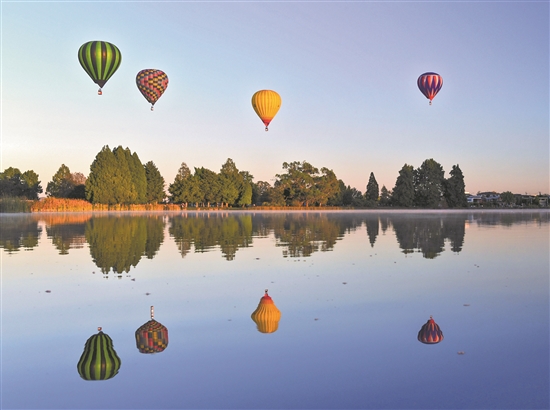当地时间3月20日清晨,放飞的热气球经过新西兰汉密尔顿湖上空。