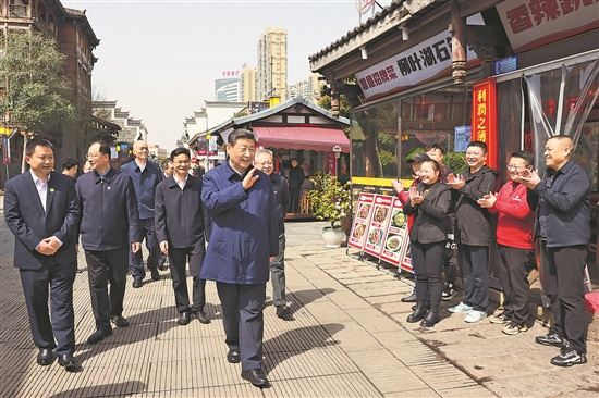 3月18日至21日,中共中央总书记、国家主席、中央军委主席习近平在湖南考察。这是19日上午,习近平在常德河街考察时,同店主和游客亲切交流。