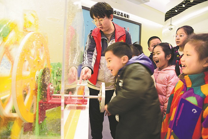 3月21日,在江苏省镇江市润州区节水教育基地体验馆,江苏科技大学志愿者带着小学生体验“水力发电”游戏。