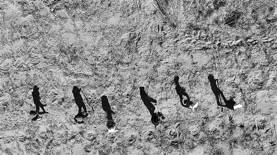 3月19日,治沙工人在白芨滩国家级自然保护区栽植柠条(无人机照片)。