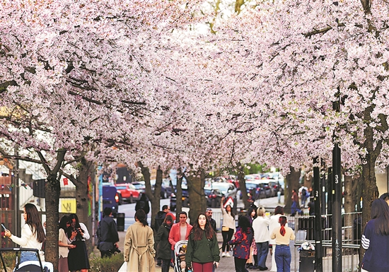 当地时间3月20日,在英国伦敦,人们漫步在春日的樱花树下。