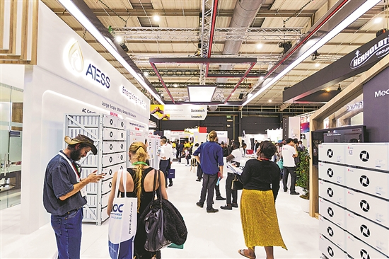 近日,为期3天的光伏及储能产业展在南非约翰内斯堡开幕,吸引全球超过350家展商参加。图为人们在南非约翰内斯堡的光伏及储能产业展上参观。