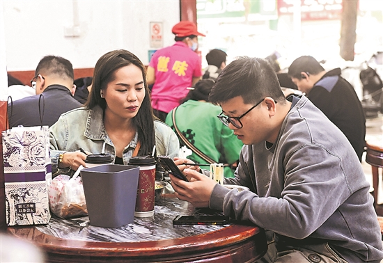 3月20日,在广西南宁市人民西路一家老友粉店,顾客在吃老友粉。老友粉是广西南宁市具有独特地方风味的食品,它的制作技艺已被列入广西非物质文化遗产名录,深受人们的喜爱。