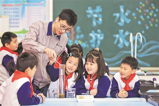 3月21日,在山东省青岛弘德小学,污水处理厂讲解员指导学生做实验。3月22日世界水日,各地举行形式多样的爱水节水护水活动,提升公众环保意识,守护生态环境。