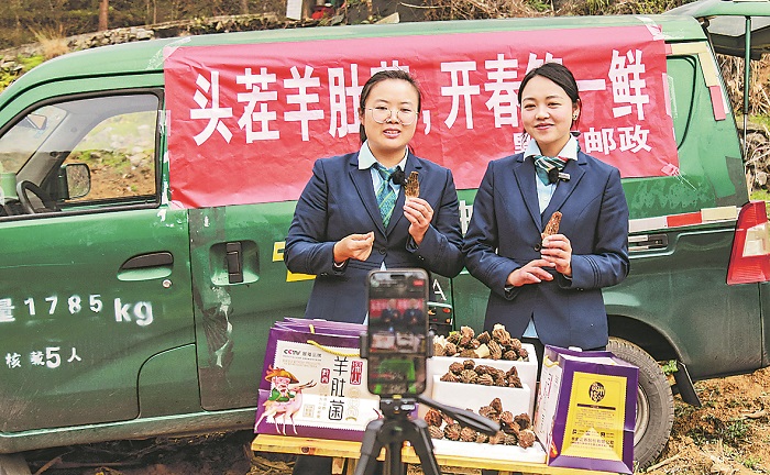 3月20日,贵州省黔西市甘棠镇梨子冲村大棚基地,邮政工作人员正在直播介绍羊肚菌。本报通讯员 张晶 摄