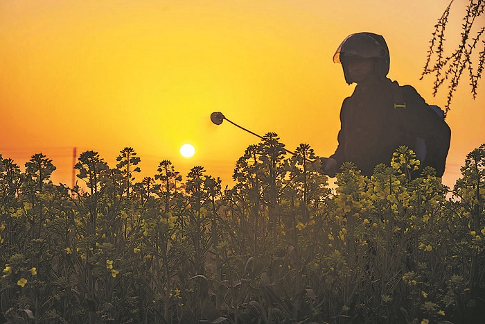 3月20日,村民在江苏省泰州市海陵区苏陈镇院庄村油菜田间喷洒农药。本报通讯员 汤德宏 摄