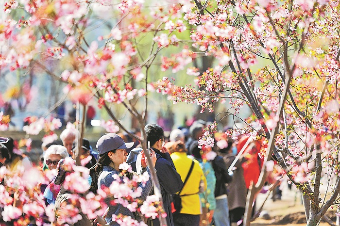 3月22日,北京玉渊潭公园,游客在打卡拍照。近日,玉渊潭公园第三十五届樱花文化活动暨第五届春季花卉联展拉开序幕。园区打造了赏特色花卉、观特色展览、参特色互动、享特色体验、购特色文创5大板块共10余项内容,多维度展示公园文化。本报记者 蔚可任 摄