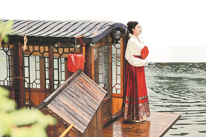 90后女孩杨锦是北京一家“新中式”服装品牌的主理人。今年春节期间,杨锦设计的一款以中国红为主色调的“新中式”上衣,成为店内的爆款商品。“这件衣服用料为红色漳缎,是一种非遗面料。在设计时,我融入了竹子、如意、祥云等图案,再搭配上经典盘扣,让这件衣服具有东方美学的独特韵味。”杨锦说。