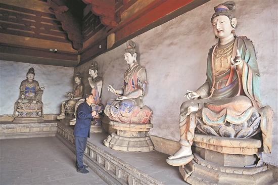 3月16日,在法兴寺圆觉殿,张宇飞记录宋代彩塑的保存状况。