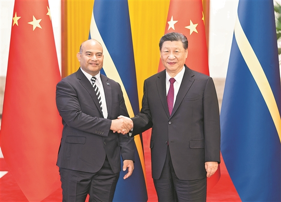 习近平强调,平等待人是中国外交的鲜明品格。中方始终主张,国家不分大小、强弱、贫富,都是国际社会平等的一员。中国始终是发展中国家一员,中国在联合国安理会的这一票永远属于发展中国家。中瑙关系是彼此尊重、平等互惠、相互支持的关系。中方坚定支持瑙鲁维护国家主权、安全、发展利益,坚定支持瑙鲁独立自主走符合本国国情的发展道路,愿同瑙方加强各层级、各领域交流对话,不断增进相互理解和信任,夯实两国关系的政治基础。