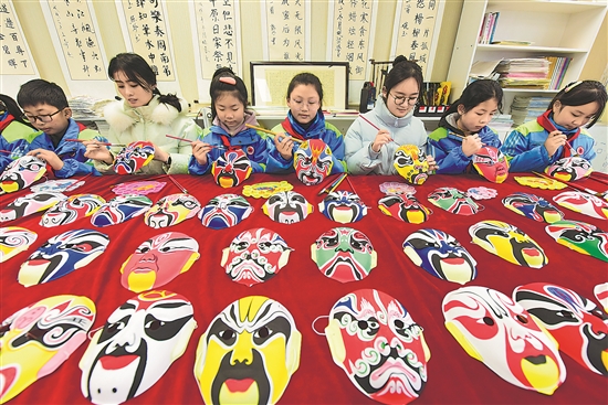 3月25日,江苏省连云港市东海县温泉镇中心小学老师和学生绘制“京剧脸谱”。当日,该校开展了“绘脸谱 扬国粹”的主题活动,让学生了解中国戏剧文化,迎接3月27日“世界戏剧日”的到来。本报通讯员 张正友 摄