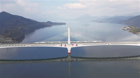 3月26日,池黄高铁试运行列车行驶在黄山市黄山区太平湖特大桥上(无人机照片)。