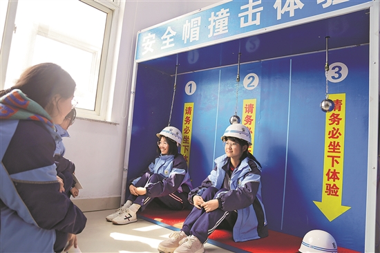 3月26日,在山东省滨州市沾化区大高镇应急救援站,学生们体验安全帽撞击。