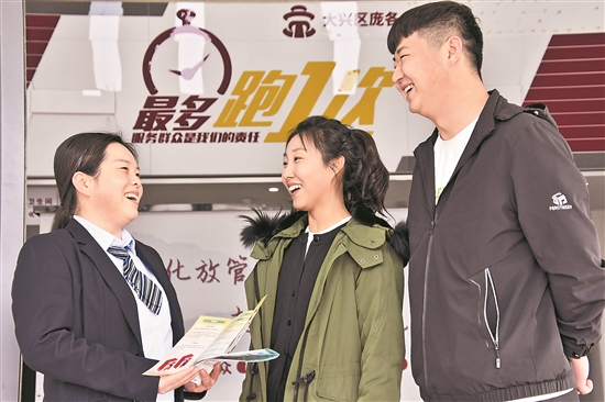 3月25日,北京市大兴区庞各庄镇政务服务中心的工作人员在为群众介绍便民服务措施。