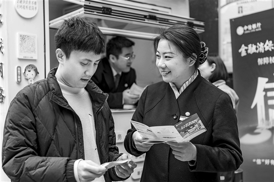 近日,中信银行北城天街支行金融网格员邵曼(右)给市民宣讲金融反诈知识。为防范涉众金融风险,国家金融监督管理总局重庆监管局指导辖区金融机构与街道、社区、商圈、园区等一道深入网格开展防范电信诈骗、防范非法集资等公益宣传。新华社记者 黄伟 摄
