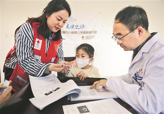 3月27日,在克拉玛依市残联,中国红十字基金会的工作人员(左)给做检查的小朋友送糖果。近日,由中国红十字基金会开展的“天使之旅”先心病患儿公益筛查救助行动走进新疆,医疗专家团队和红十字志愿者在乌鲁木齐、阿勒泰、克拉玛依、塔城等地筛查先心病儿童,其中符合手术指征的患儿将免费接受治疗。 新华社记者 刘勇贞 摄
