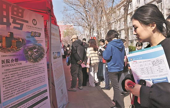 3月31日,天津医科大学2024届毕业生春季专场招聘会在学校世纪大道举行。据了解,来自全国10余个省市的约300家医疗卫生单位带来了数千个就业岗位供毕业生选择。