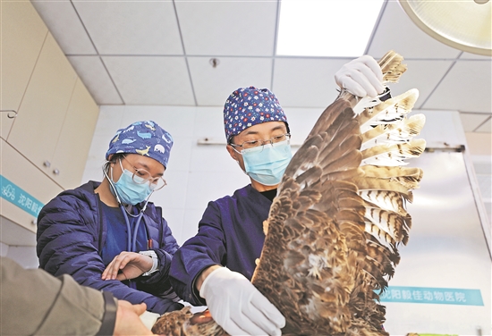 3月26日,在辽宁沈阳毅佳动物医院,姜代山(右)和护士对受伤的大鵟进行外伤检查。