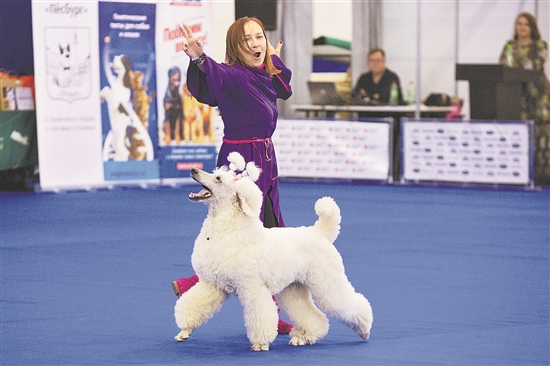 这是当地时间3月30日在俄罗斯圣彼得堡春季宠物展上拍摄的宠物表演。俄罗斯圣彼得堡当地时间3月30日至31日举行春季宠物展。新华社发 (莫京娜 摄)