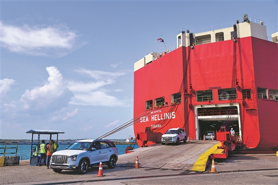 近日,在斯里兰卡汉班托塔港,滚装船卸运汽车。新华社记者 徐钦 摄