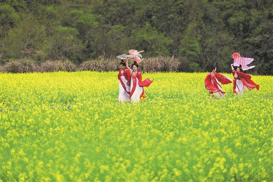 3月31日,在安徽省黄山市休宁县齐云山镇南坑村,游客在油菜花田游玩。