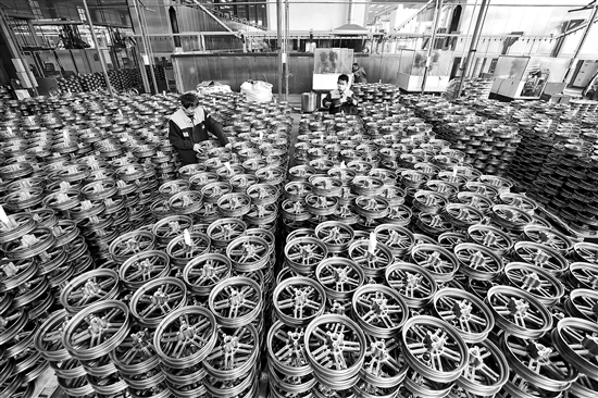 3月30日,位于安徽省淮北市濉溪经济开发区的一家公司生产车间内,工人正在生产摩托车和电动车轮毂等配套产品。