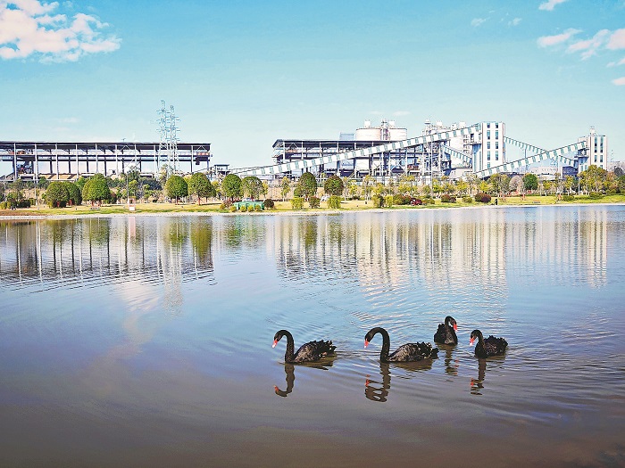 3月21日,4只黑天鹅在中国宝武新钢集团青花瓷公园的人工湖里时而嬉戏,时而觅食,悠闲自在。这些小精灵为工厂增添了一道美丽的风景。张俊 龚小华 摄