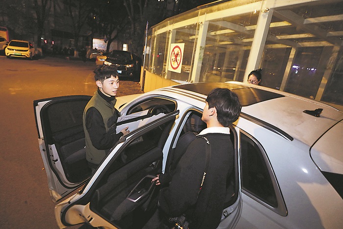 3月28日晚,南京市鼓楼区华阳佳园社区党群服务中心,石远宇(左一)和老师们下课后一起回家。